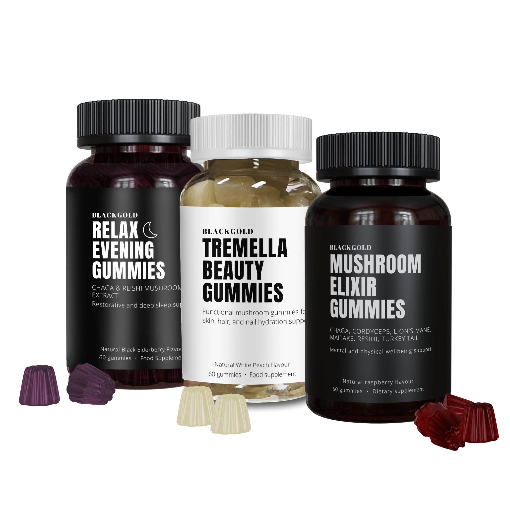 These gummies contains our Blackgold Relax Evening Blend which is made up of organic - Chaga & Reishi mushroom extracts. This is combined with a delicious natural elderberry flavor to bring your a unique gummy experience that not only tastes great but delivers the amazing benefits of our formulated Mushroom Blend.